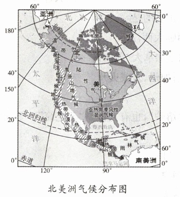7. 读北美洲气候分布图。下列关于北美洲气候特点的叙述,正确的是(
