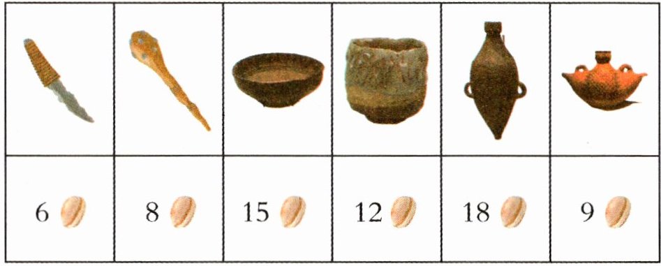 3 笑笑根据古人的“交易市场”调查了以下几种物品所值的贝币。请你看一看,完成下面的填空。