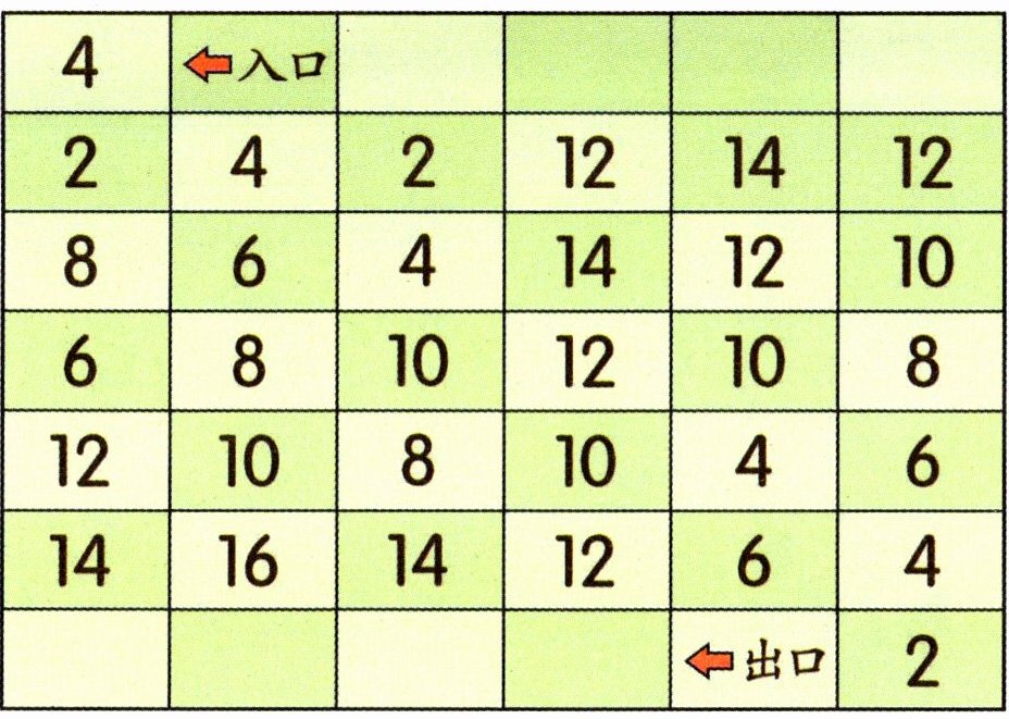 1 淘气和笑笑在森林里遇见了一个数字迷宫,从左上角 4 的方格出发,到右下角 2 的方格结束。按照相邻方格相差 2 的顺序走,并且每个方格都只能走一次。请画出行走路线。快来试试吧!
