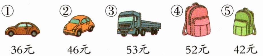 2 小林有100元,要买一辆玩具车和一个书包,可以怎么买?应付多少元?请你写出几种买法,再列出算式。