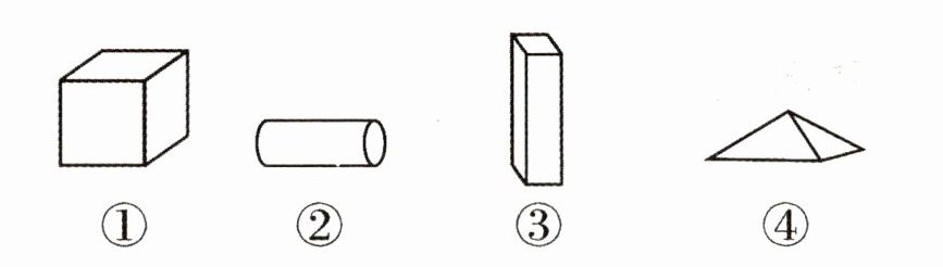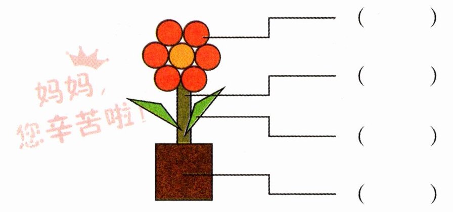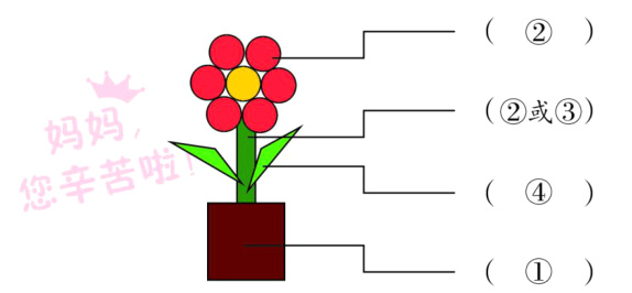 1 笑笑用积木作了一幅画,把它当作生日礼物送给妈妈。你知道画里的这盆花是用哪些形状的积木印出来的吗?填一填。(填序号)