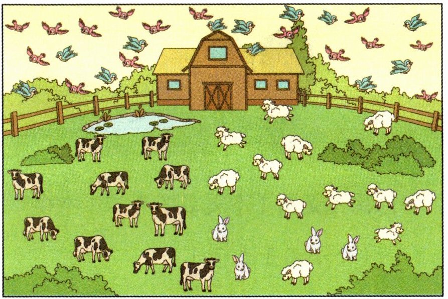 1 淘气和笑笑来到了农场,这里的风景可真美啊,农场里还有很多动物呢!请你仔细观察,认真思考。
