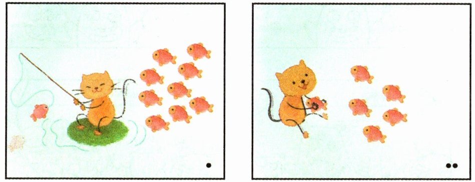 1 “手指画”乐园里有许多有趣的故事,先说一说图中的故事,再算一算小猫已经吃掉了几条鱼。