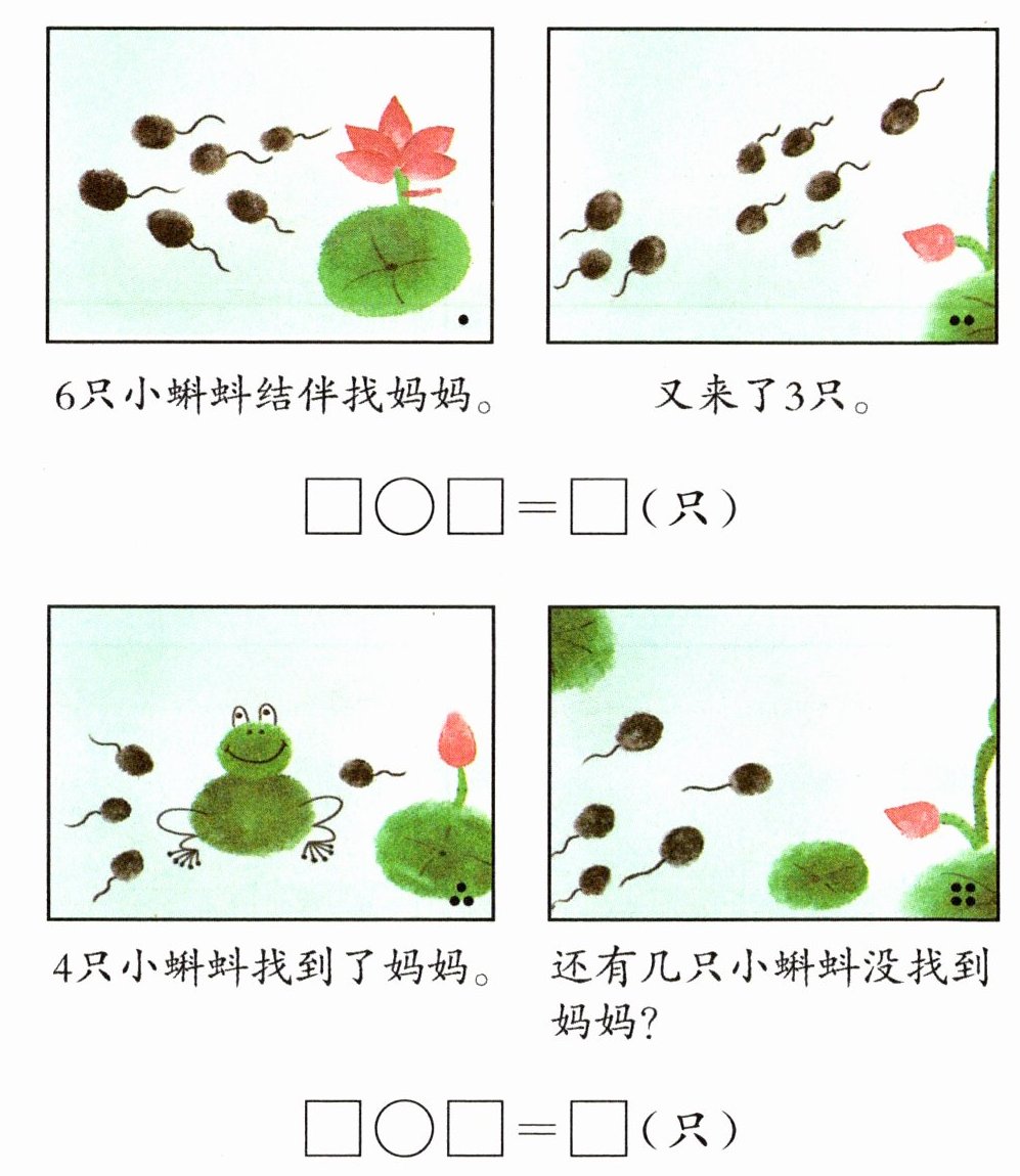 2 可爱的小蝌蚪要去找妈妈了,先把故事讲给爸爸妈妈听一听,然后尝试解决问题。
