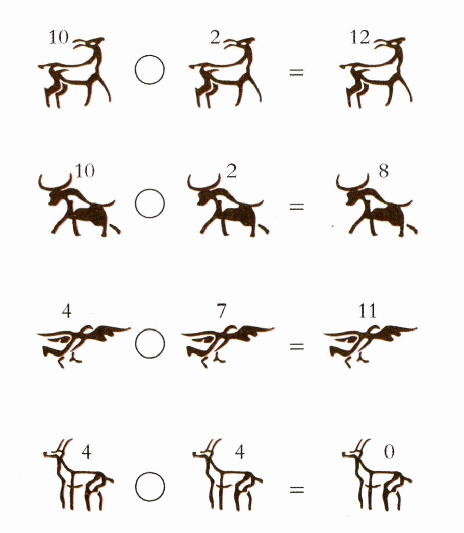 2 岩画的内容丰富多彩,多以动物为主。请你根据下面动物的数量,在$◯$里填上“$+$”或“$-$”吧!