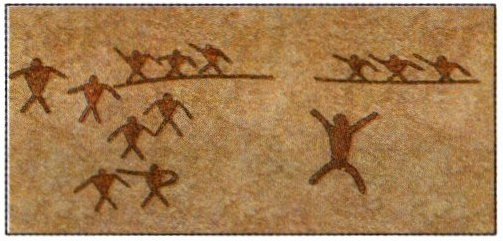 1 岩画是一种石刻文化,在没有文字的远古时代,人类用石头、金属在岩石上画画。如图是古人征战的场景,请你画一画,并算一算,一共有多少人参加征战?