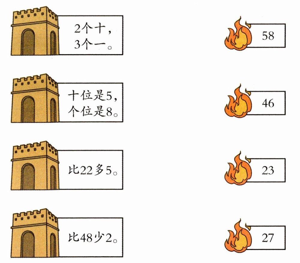 2 笑笑了解到长城的烽火台是古人在战争时,用于点燃烟火传递信息的高台。请你把火苗与对应的烽火台连一连。