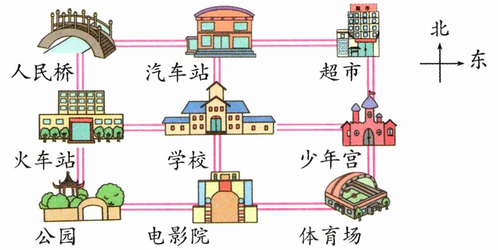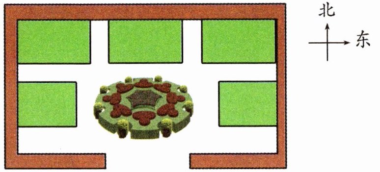4 笑笑说:“走进公园大门,正北面有花坛和高空观览车。花坛的东面是过山车,西面是旋转木马。卡丁车和碰碰车的场地分别在公园的西北角和东北角……”