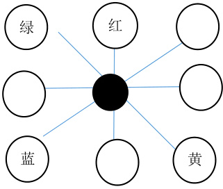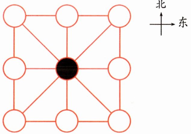 涂上红色,东南方向的○涂上黄色,西北方向的○涂上绿色,西南方向的○涂上蓝色。