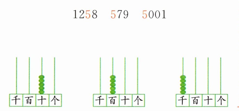 (1)1258 中的“5”表示 5 个十。579 中的“5”表示 5 个百。5001 中的“5”表示 5 个千。(2)略
