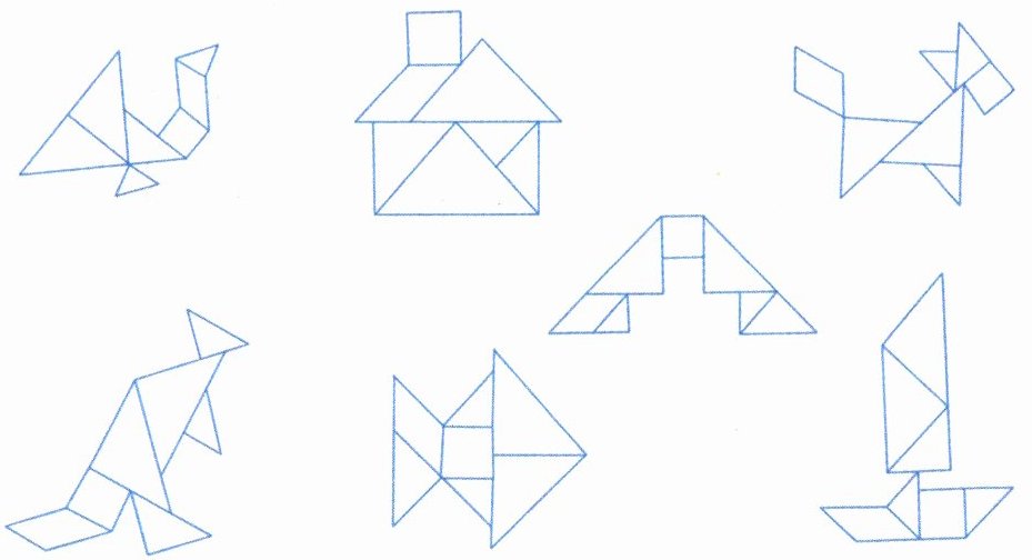 拼一拼:用七巧板拼出下面的图案;想一想:每个图案像什么?