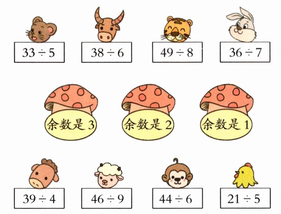 余数是3的算式:$33÷5$ $39÷4$ 余数是2的算式:$38÷6$ $44÷6$ 余数是1的算式:$49÷8$ $36÷7$ $46÷9$ $21÷5$