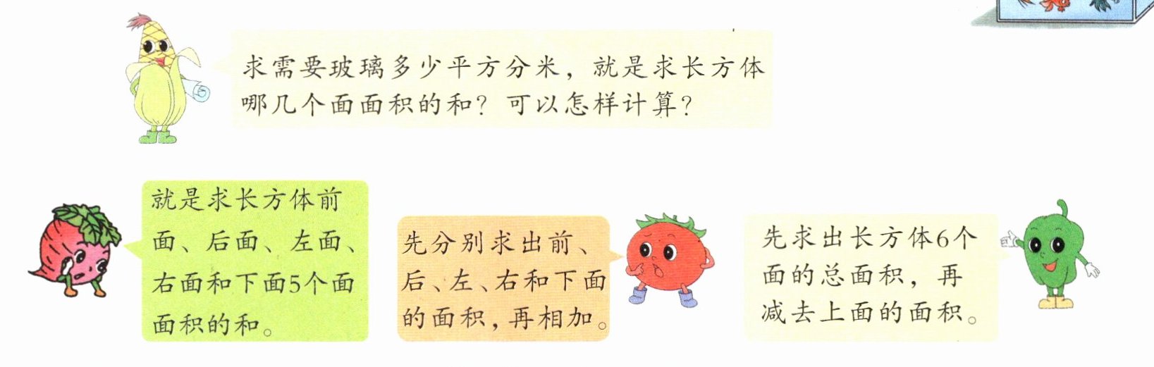 过程探索 求玻璃总面积的方法有:(1)分别求出前、后、左、右和下面的(),再相加;(2)用前、后两个面的面积和,加上左、右两个面的面积和,再加()的面积;(3)先求出长方体的表面积,再减去()的面积。