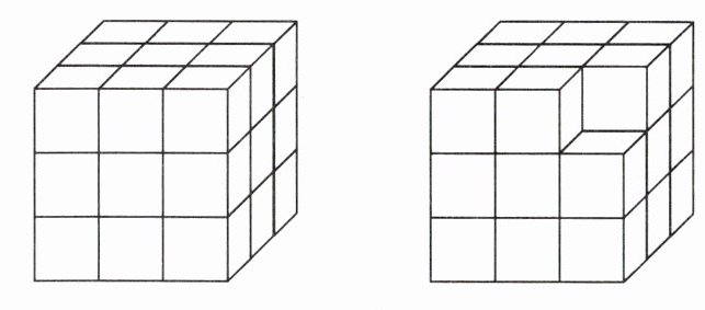 提示 左图由 27 个小正方体组成,右图由 26 个小正方体组成。左图玩具的体积大,两个玩具的表面积相等。