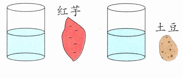 4. 把红芋和土豆分别放在如图所示的两个同样的杯子里。哪个杯子里的水上升的多?