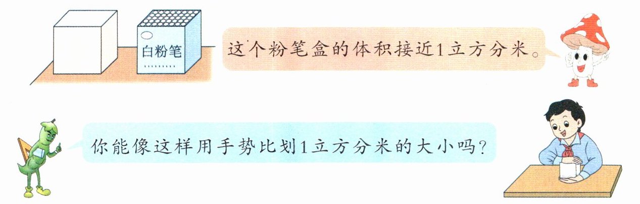 棱长1分米的正方体,体积是1立方分米。能用手势比划1立方分米的大小。