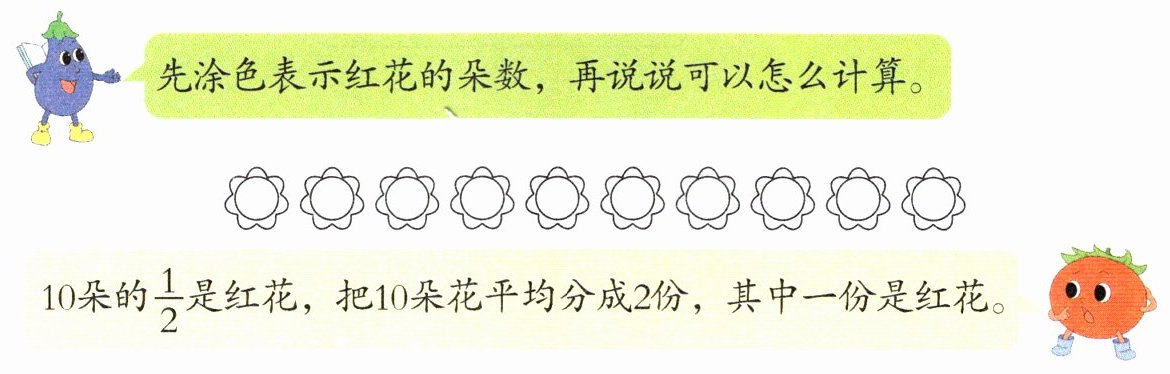求10朵的$\frac {1}{2}$是多少,可以用乘法计算。