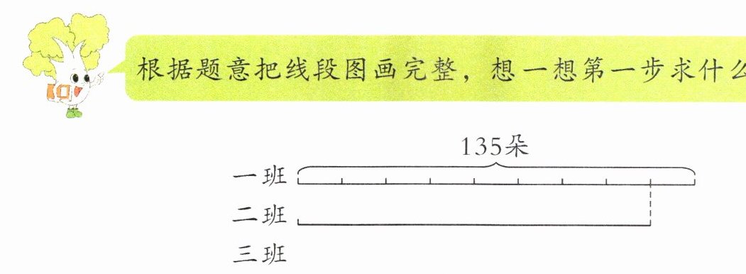 将线段图补充完整,如图。先求出二班做的朵数,再求出三班做的朵数。可以像下面这样分步计算。