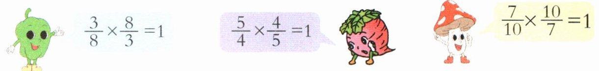 乘积是1的两个数互为倒数。例如,$\frac{3}{8}和\frac{8}{3}$互为倒数,也可以说$\frac{3}{8}的倒数是\frac{8}{3}$,$\frac{8}{3}的倒数\frac{3}{8}$。
