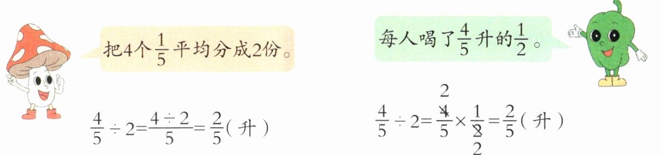 \frac { 4 } { 5 } ÷ 2 = ____()把4个$ \frac { 1 } { 5 } $平均分成2份。$ \frac { 4 } { 5 } ÷ 2 = \frac { 4 ÷ 2 } { 5 } = \frac { 2 } { 5 } ( \text { 升 } ) $每人喝了$ \frac { 4 } { 5 } $升的$ \frac { 1 } { 2 } 。$$ \frac { 4 } { 5 } ÷ 2 = \frac { \overset { 2 } { \bcancel { 4 } } } { 5 } × \frac { 1 } { \underset { 1 } { \bcancel { 2 } } } = \frac { 2 } { 5 } ( \text { 升 } ) $