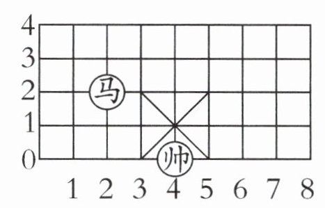 传统文化 象棋 下图是中国象棋棋盘的一部分。图中“马”现在的位置用$(2,2)$表示,要想使“马”走到现在“帅”的位置,至少需要走多少步?写出“马”所走的路线。(提示:中国象棋中“马走日”指“马”从“日”字形格子的一个顶点走向相对的另一个顶点)