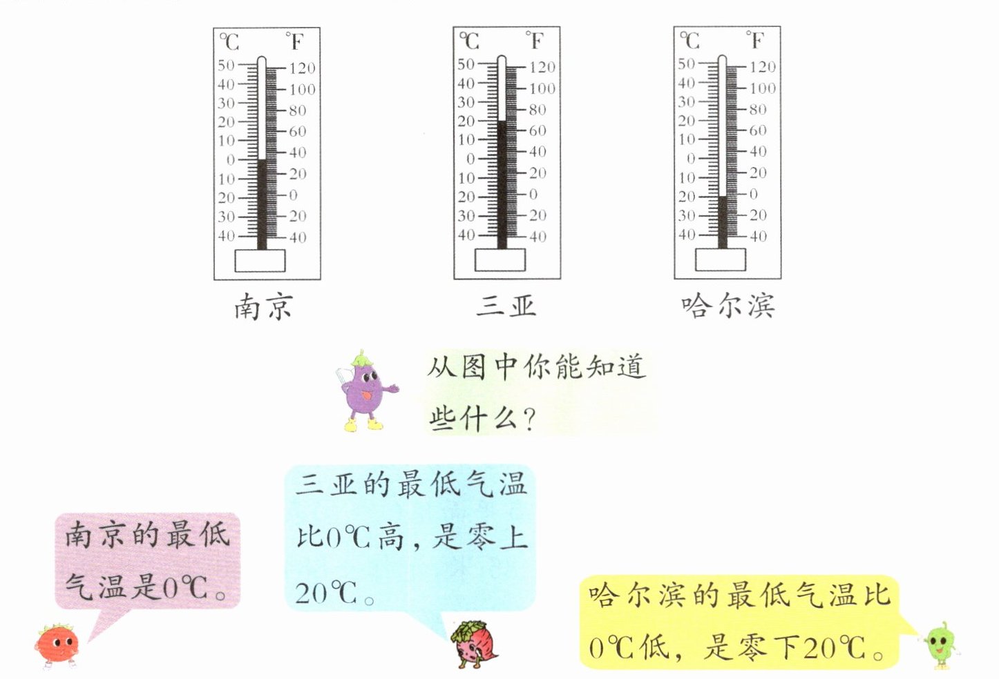 完全解答 南京的温度计液面正好指着0℃,说明南京的最低气温是0℃,读作零摄氏度;三亚的温度计液面指在0上方的第2个大格,说明三亚的最低气温是零上20℃,读作零上二十摄氏度;哈尔滨的温度计液面指在0下方的第2个大格,说明哈尔滨的最低气温是零下20℃,读作零下二十摄氏度。“+20℃”和“-20℃”表示两种相反意义的量,“+20℃”表示零上20摄氏度,“-20℃”表示零下20摄氏度。