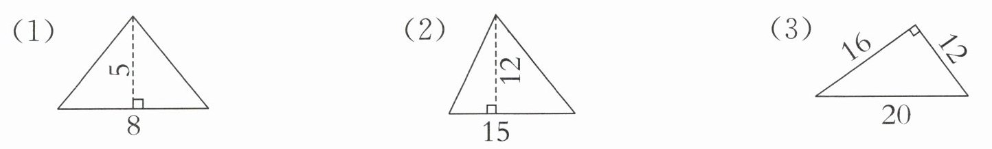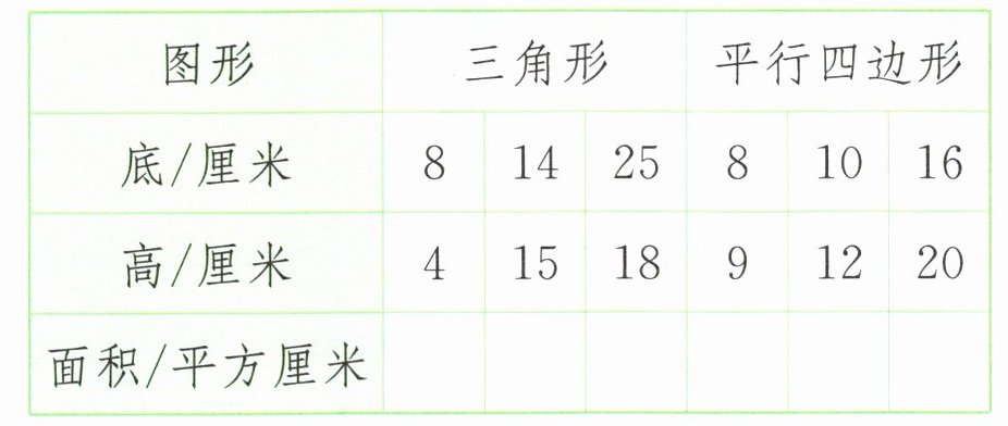 1. 下表中给出的是三角形和平行四边形的底和高,算出每个图形的面积,将下表填写完整。