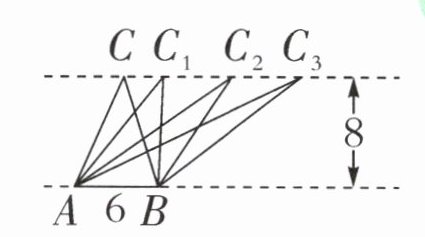 8. 新考法 等积变形 将点C在直线上移动,得到点$C_{1},C_{2},C_{3}$,与AB形成了4个三角形,如右下图,求出图中4个三角形的面积。(单位:厘米)