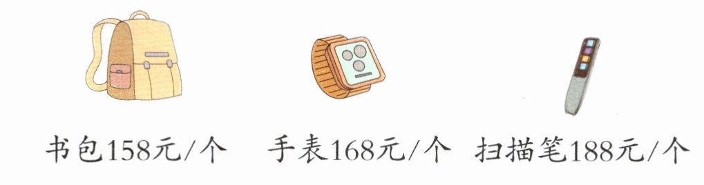 手表:$168×18=3024$(元) 扫描笔:$188×18=3384$(元) $3384>3024>3000>2844$ 老师应该选购书包,买这些奖品一共要花 2844 元。