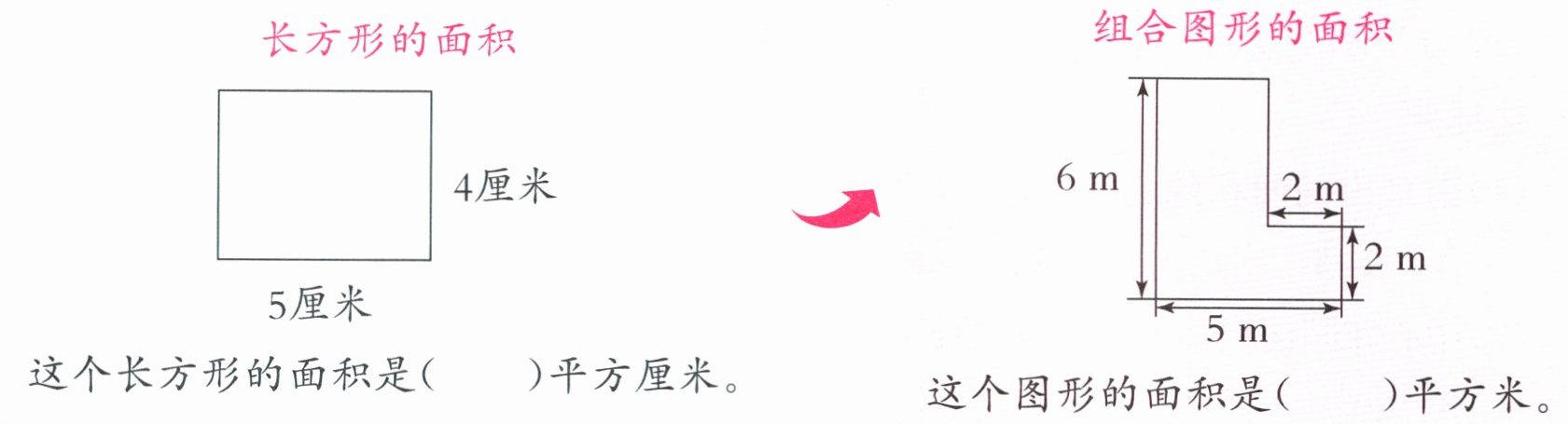 过程探索 求草坪的面积就是求组合图形的面积。求组合图形的面积时,无法利用学过的面积计算公式直接计算时,可以先把组合图形分割或补成简单的图形,再利用简单图形的面积计算公式进行计算。