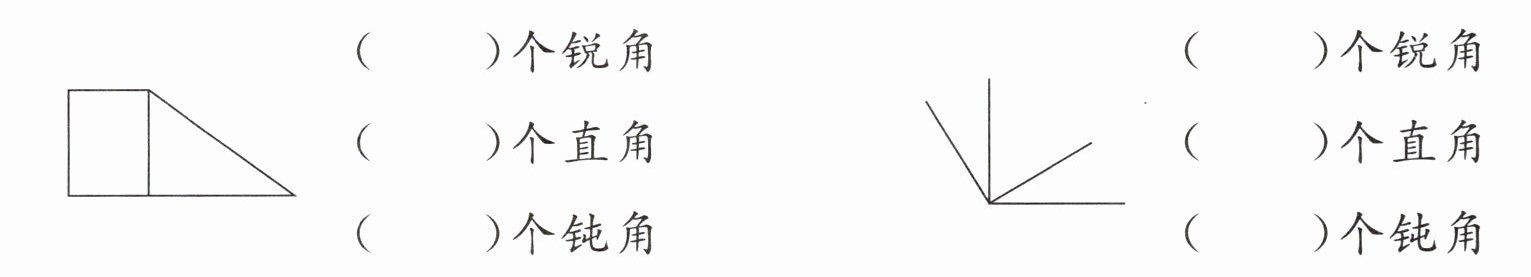 1. 一把直角三角尺上有()个角,其中有()个直角,()个锐角;直角比()角大,比()角小。