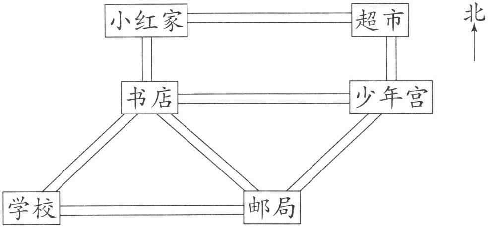 (3)小红和妈妈从家出发,先向南走到书店,再向东南走,她们到了()。
