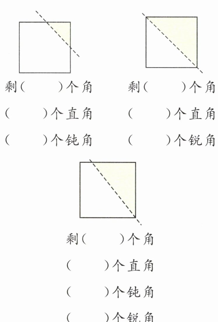 4. 分别减去正方形的一个角,可以怎么剪?还剩几个角?各是什么角?填一填。