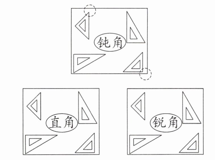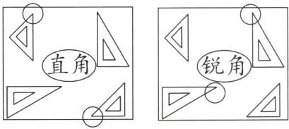 提示借助三角尺上的直角比一比,比直角小的是锐角,比直角大的是钝角。