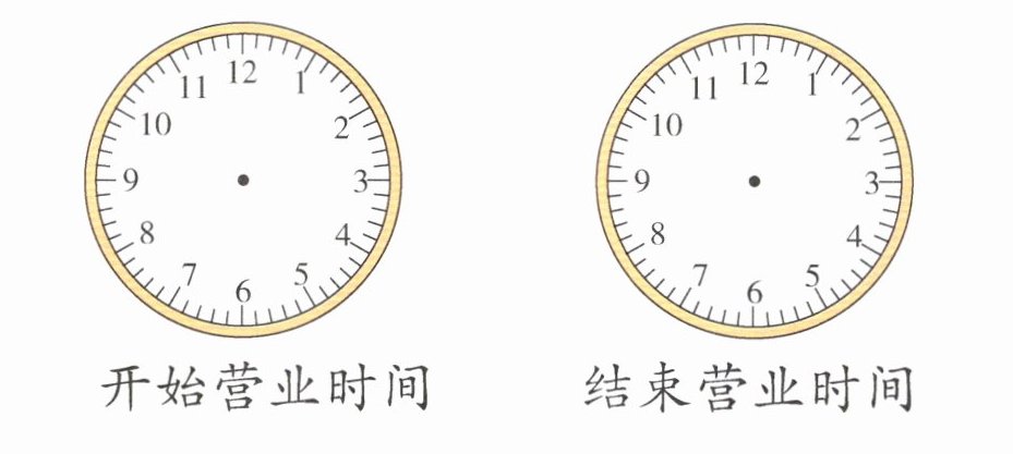 3. 某餐饮店的营业时间是8:00~21:00,请在下面两个钟面上画出开始营业时间和结束营业时间。