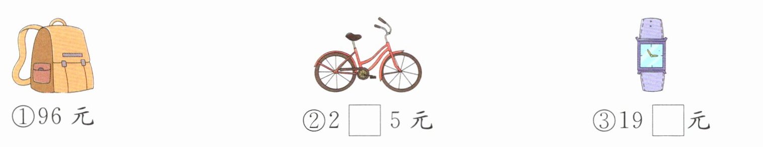 2. 三种物品的价格如下图,但有的数位上的数字被挡住了。笑笑付给收银员300元,她买的两样物品是()和()。