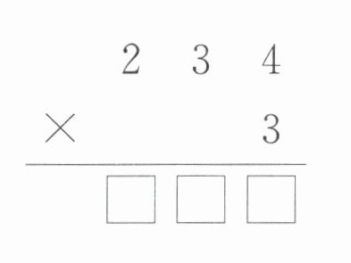 过程探索 方法一:利用数的组成,将234拆分成几个部分,分别与3相乘,再把所得的积相加,从而得出结果。同时,结合图形通过圈一圈的方式,更直观地理解计算过程。拆分数字:把234拆分成$200+30+4$。分别计算乘积:$200×3= 600$,这表示2个百乘3得到6个百;$30×3= 90$,即3个十乘3得到9个十;$4×3= 12$,也就是4个一乘3得到12个一。计算总和:$600+90+12= 702$,所以$234×3= 702$。图图可在图中操作:对于$200×3$,可以把图中表示整百的较大的正方形区域,每2个一组圈3组,表示2个百乘3。对于$30×3$,把表示整十的长条区域,每3个一组圈3组,表示3个十乘3。对于$4×3$,把单独的小方块,每4个一组圈3组,表示4个一乘3。