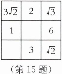 6$\sqrt{2}$ [解析]本题考查了二次根式的乘法运算法则,熟练掌握二次根式的加减乘除运算法则是解决此类题的关键。先将表格中最上一行的3个数相乘得到6$\sqrt{6}$,然后中间一行的三个数相乘以及最后一行的三个数相乘都是6$\sqrt{6}$,即可求解。由题意可知,第一行三个数的乘积为3$\sqrt{2}$×2×$\sqrt{3}$=6$\sqrt{6}$,设第二行中间数为x,则1×x×6=6$\sqrt{6}$,解得x=$\sqrt{6}$,设第三行第一个数为y,则y×3×$\sqrt{2}$=6$\sqrt{6}$,解得y=2$\sqrt{3}$。