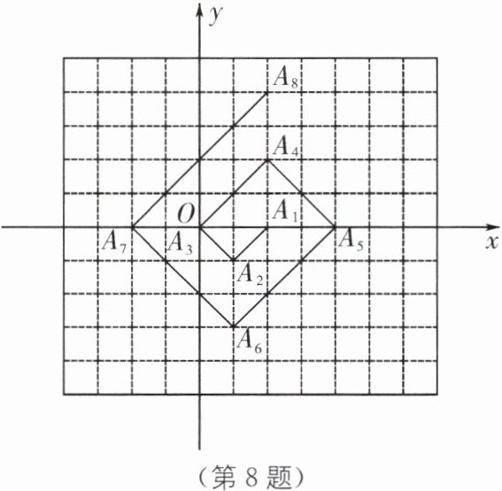 8. 如图,网格中的每个小正方形的边长都是$1$,$A_1$、$A_2$、$A_3$、…$$都在格点上,$\triangle A_1A_2A_3$、$\triangle A_3A_4A_5$、$\triangle A_5A_6A_7$、…$都是斜边在x$轴上,且斜边长分别为$2$、$4$、$6$、…$$的等腰直角三角形。若$\triangle A_1A_2A_3的三个顶点坐标为A_1(2,0)$、$A_2(1,-1)$、$A_3(0,0)$,则依图中的规律,$A_{19}$的坐标为(