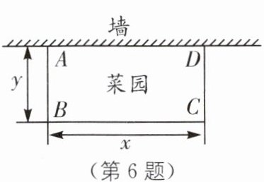 6. 李大爷要围成一个矩形菜园,菜园的一边利用足够长的墙,用篱笆围成的另外三边总长应恰好为24米。要围成的菜园是如图所示的矩形$ABCD$。设边$BC的长为x$米,边$AB的长为y$米,则$y与x$之间的函数表达式是(