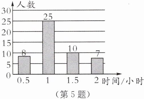 5. 为了解学生体育锻炼的用时情况,陈老师对本班50名学生一天的锻炼时间进行调查,并将结果绘制成如下统计图,那么一天锻炼时间为1小时的人数占全班人数的(