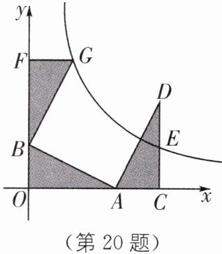 20. 如图,点 $ A $、$ B $ 分别在 $ x $、$ y $ 轴上,点 $ D $ 在第一象限内,$ DC \perp x $ 轴于点 $ C $,$ AO = CD = 2 $,$ AB = DA = \sqrt { 5 } $,反比例函数 $ y = \frac { k } { x } ( k > 0 ) $ 的图像过 $ CD $ 的中点 $ E $.