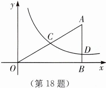 18. 如图,$ \mathrm { Rt } \triangle ABO $ 的顶点 $ O $ 在坐标原点,点 $ B $ 在 $ x $ 轴上,$ \angle ABO = 90 ^ { \circ } $,$ \angle AOB = 30 ^ { \circ } $,$ OB = 2 \sqrt { 3 } $,反比例函数 $ y = \frac { k } { x } ( x > 0 ) $ 的图像经过 $ OA $ 的中点 $ C $,交 $ AB $ 于点 $ D $.