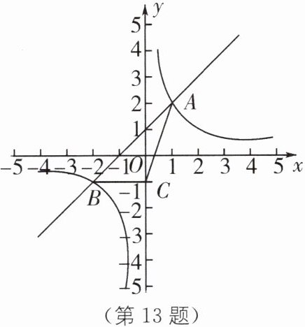 13. 如图,反比例函数$y= \frac{k}{x}的图像与一次函数y= x+b的图像交于A$、$B$两点,点$A和点B$的横坐标分别为1和$-2$,这两点的纵坐标之和为1。