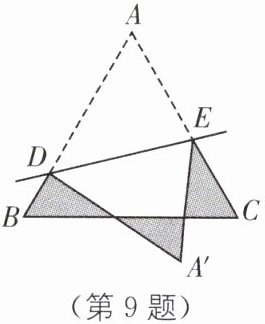 9. 如图,等边三角形 $ABC$ 的边长为 $1\mathrm{cm}$,$D$、$E$ 分别是 $AB$、$AC$ 上的点,将 $\triangle ADE$ 沿直线 $DE$ 折叠,点 $A$ 落在点 $A'$ 处,且点 $A'$ 在 $\triangle ABC$ 外部,则阴影部分图形的周长为