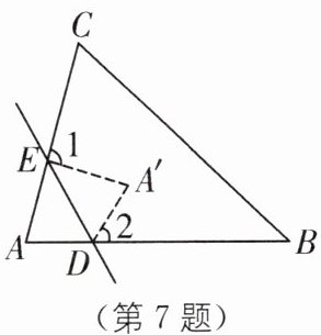 7. 如图,在折纸活动中,小明制作了一张 $\triangle ABC$ 纸片,点 $D$、$E$ 分别在边 $AB$、$AC$ 上,将 $\triangle ABC$ 沿着 $DE$ 折叠压平,$A$ 与 $A'$ 重合。若 $\angle A = 75^{\circ}$,则 $\angle 1 + \angle 2$ 等于(