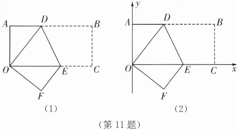 11. 如图(1),在矩形 $OABC$ 中,$AB = 8$,$OA = 4$,把矩形 $OABC$ 折叠,使点 $B$ 与点 $O$ 重合,点 $C$ 移到点 $F$ 位置,折痕为 $DE$.