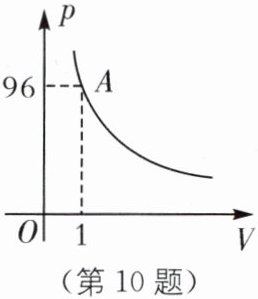 10. 某气球内充满了一定质量的气体,在温度不变的条件下,气球内气体的压强p(kPa)是气球体积$V(m^3)$的反比例函数,其图像经过点A(如图). 当气球内的气压大于144 kPa时,气球将爆炸,为确保气球不爆炸,该气球的体积应(