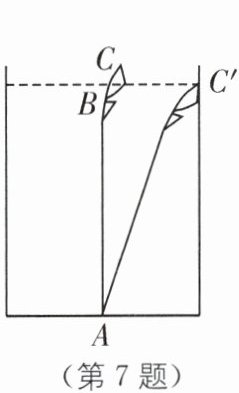 7. 《九章算术》中一道“引葭赴岸”问题:“今有池一丈,葭生其中央,出水一尺,引葭赴岸,适与岸齐,问水深,葭长各几何?”题意是:有一个池塘,其地面是边长为10尺的正方形,一棵芦苇AC生长在它的中央,高出水面部分BC为1尺,如果把该芦苇沿与水池边垂直的方向拉向岸边,那么芦苇的顶部C恰好碰到岸边的C'处(如图),水深和芦苇长各多少尺? 则该问题的水深是