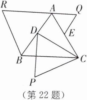 22. (江苏省第十六届初中数学竞赛)如图,已知等边三角形$ABC$,在$AB上取点D$,在$AC上取点E$,使得$AD = AE$,作等边三角形$PCD$、$QAE和RAB$,求证:$P$、$Q$、$R$是等边三角形的三个顶点。